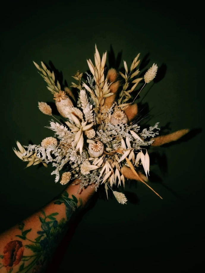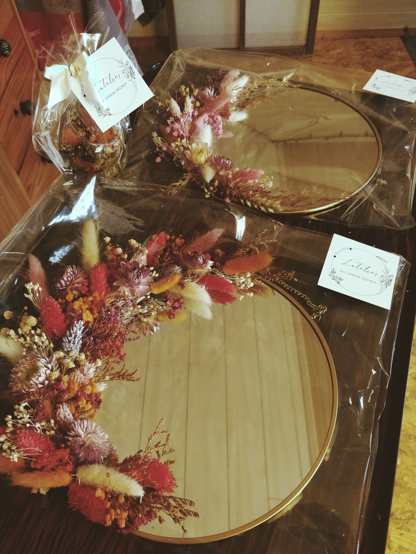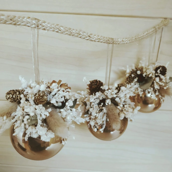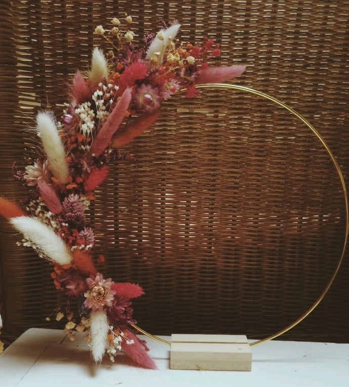 Parmi mes réalisations, vous trouverez des couronnes, des bouquets et montages floraux sur mesure, des lettres fleuries, des cloches ou encore des miroirs décorés. Chaque création est pensée pour durer, dans le respect de la matière et de la saison.