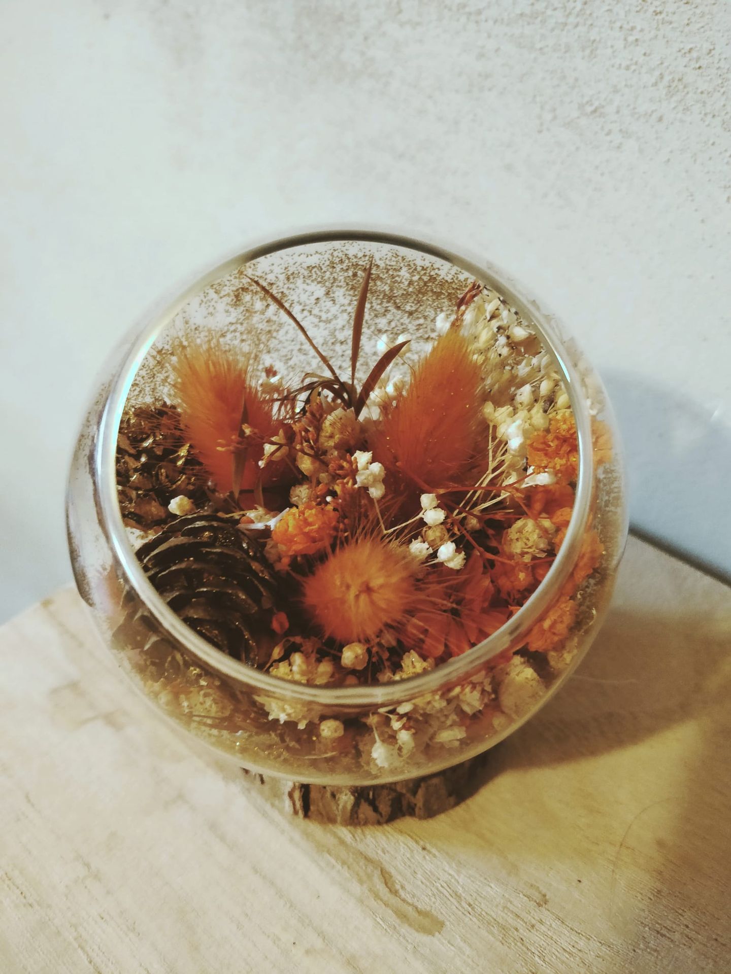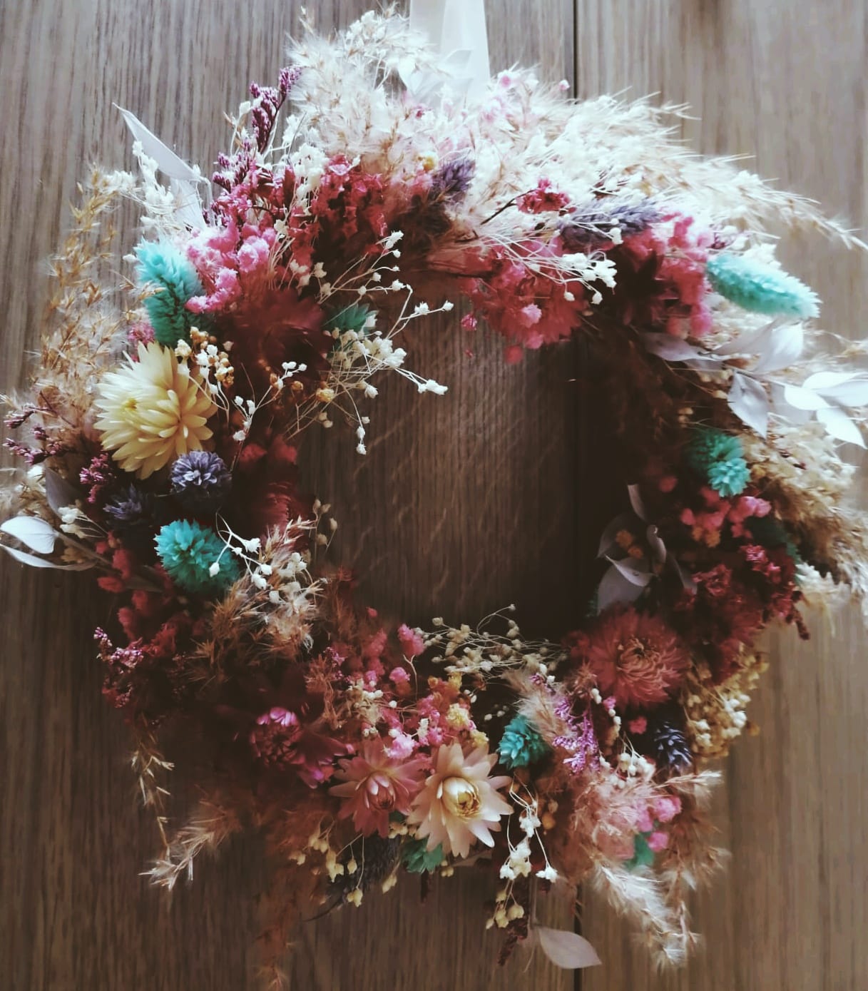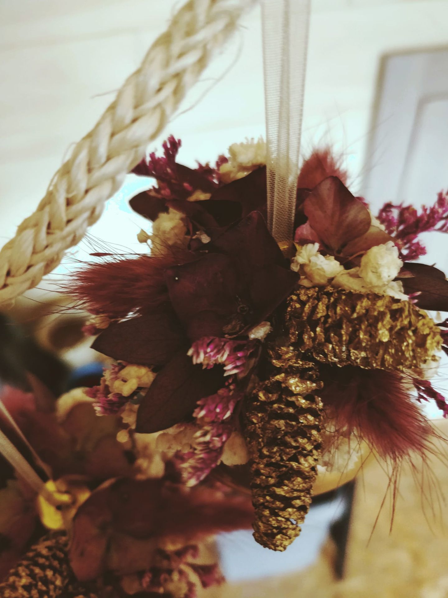 Parmi mes réalisations, vous trouverez des couronnes, des bouquets et montages floraux sur mesure, des lettres fleuries, des cloches ou encore des miroirs décorés. Chaque création est pensée pour durer, dans le respect de la matière et de la saison.